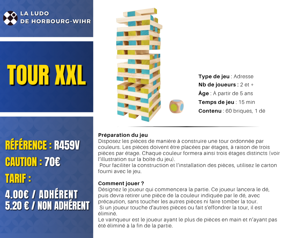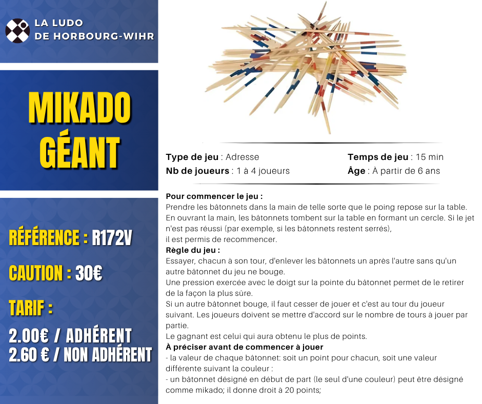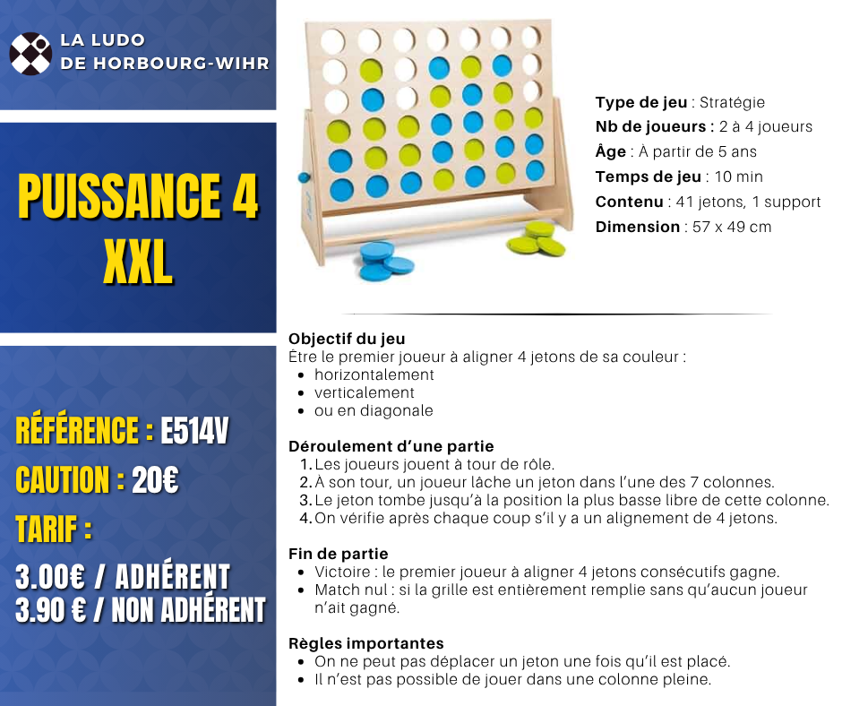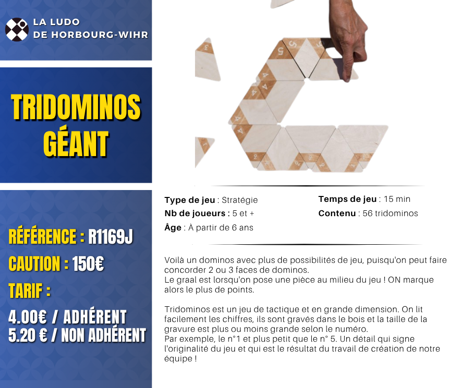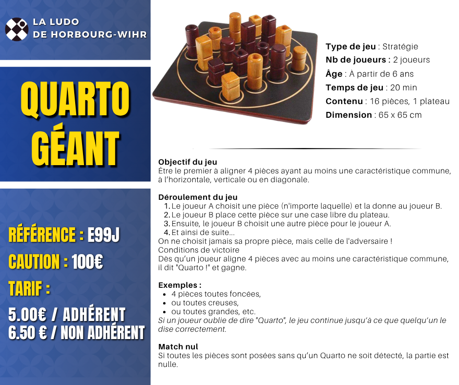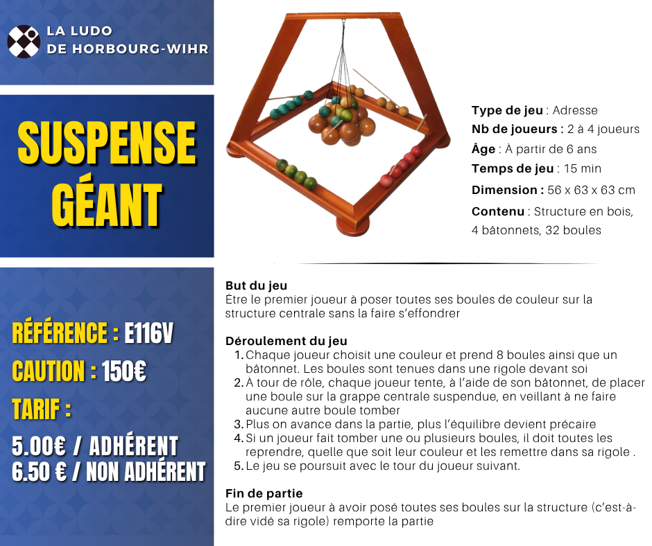 Retrouvez ci-dessous notre catalogue de jeux géants. Pour réserver, il vous suffit de transmettre au ludothécaire, via le formulaire de contact, la liste des jeux souhaités ainsi que la date de réservation.